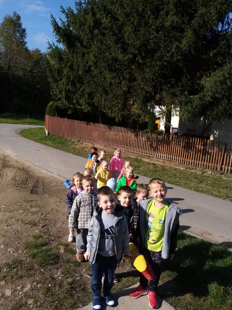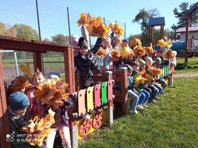 Jesień to piękna pora roku, pełna kolorów i cudownych widoków.  Piękna, słoneczna pogoda zachęca wszystkich do wyjścia na zewnątrz. Przedszkolaki wraz z paniami spacerują po okolicy podziwiając zmiany zachodzące w przyrodzie, rozpoznają drzewa po ich liściach, zbierają skarby jesieni do kącika przyrody i bawią się na świeżym powietrzu.