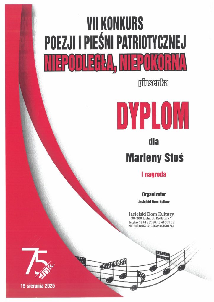15 sierpnia 2025 roku, uczennica klasy VI – Marlena Stoś wzięła udział w Koncercie Laureatów 7. Konkursu Poezji i Pieśni Patriotycznej „Niepodległa, Niepokorna”, który odbył się w Glorietce Jasielskiego Parku Miejskiego.