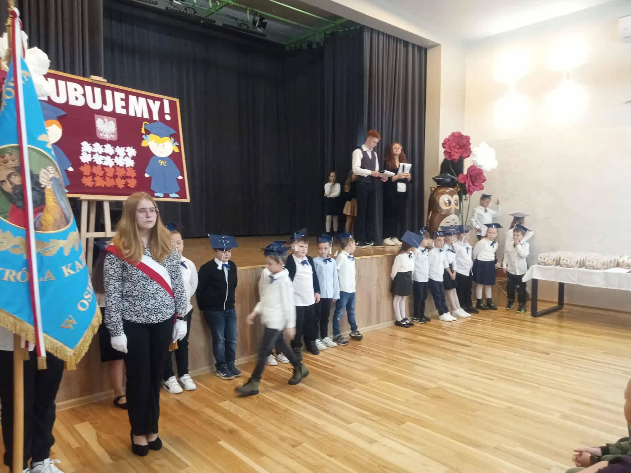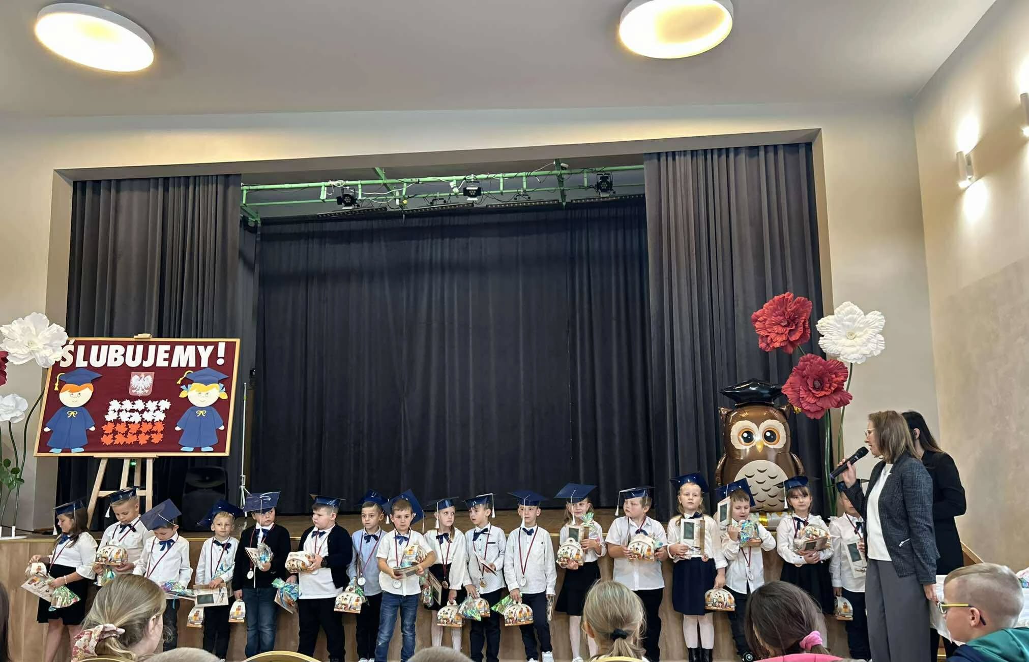 10 października 2025r. odbyła się w naszej szkole uroczystość pasowania na ucznia. Jest to szczególny dzień, który na długo pozostanie w pamięci każdego ucznia klasy pierwszej. W tym dniu dzieci oficjalnie przyjęte zostały do grona uczniów szkoły. Podczas uroczystości pierwszoklasiści pokazali, że potrafią pięknie śpiewać, tańczyć i recytować wiersze. Najważniejszą częścią uroczystości, na którą wszyscy czekali było ślubowanie oraz pasowanie wielkim ołówkiem przez Panią Dyrektor Jolantę Marek. Pierwszaki głośno i z przekonaniem przyrzekały być dobrymi i pilnymi uczniami oraz rzetelnie wypełniać swoje obowiązki.