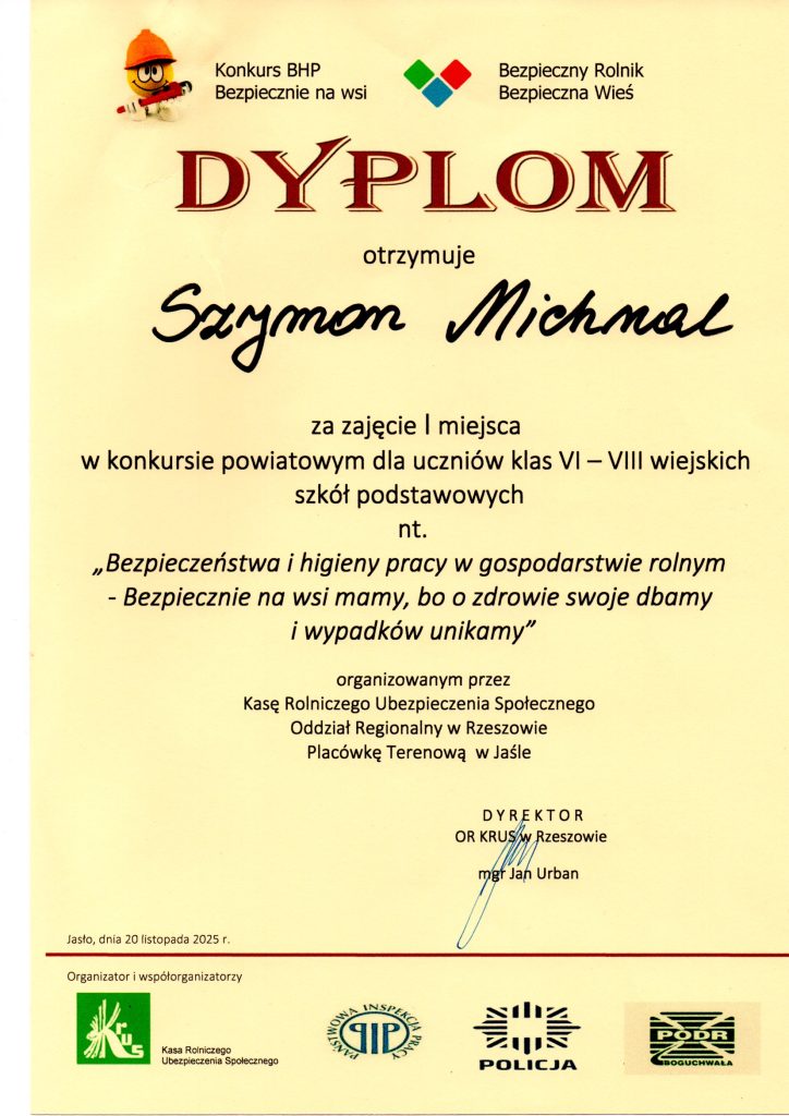 20 listopada 2025 roku odbył się powiatowy konkurs wiedzy z zakresu bezpieczeństwa i higieny pracy w gospodarstwie rolnym pod hasłem: „Bezpiecznie na wsi mamy, bo o zdrowie swoje dbamy i wypadków unikamy”, zorganizowany przez Kasę Rolniczego Ubezpieczenia Społecznego w Jaśle.