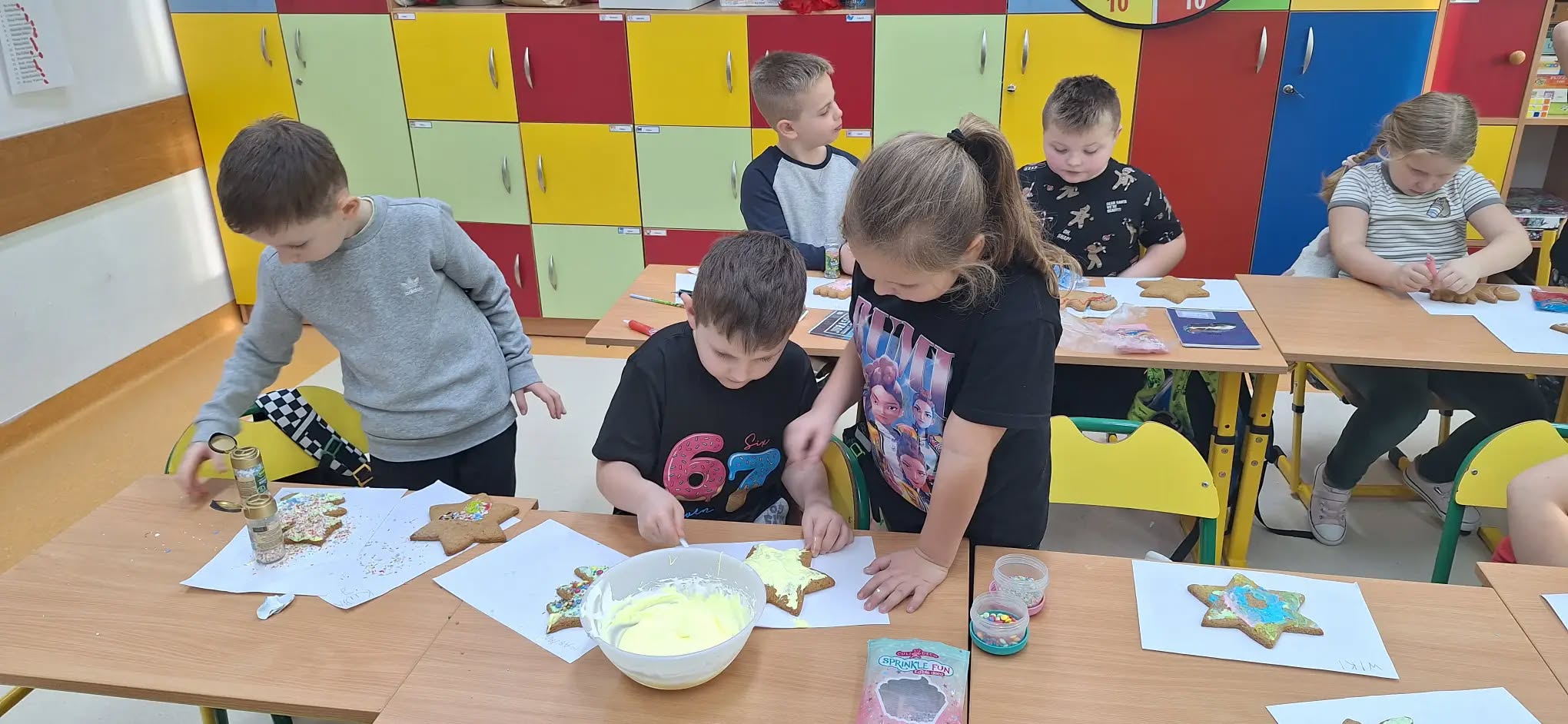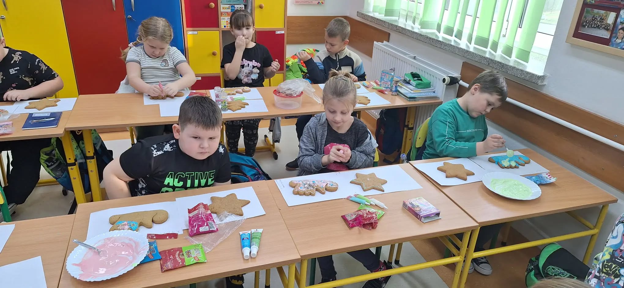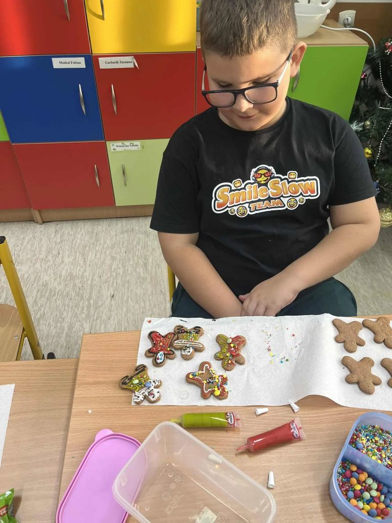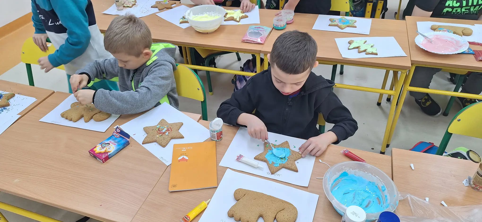 17 grudnia uczniowie klas I-III ozdabiali pierniki lukrowymi pisakami i barwnymi posypkami. Dzieci wykazały się wielkim zapałem i pomysłowością, a piernikowe choinki, gwiazdki, bombki, bałwanki przybrały świąteczny wystrój. Unoszący się w sali korzenny zapach pierników wprawił wszystkich w świąteczny nastrój.