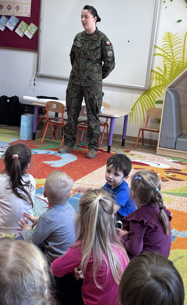 Nasze przedszkole odwiedziła wyjątkowa osoba, pani major Małgorzata Jurusik, która służy w 22 Wojskowym Ośrodku Kartograficznym. Przedszkolaki poznały zawód żołnierza, dowiedziały się, że w wojsku można pełnić różne funkcje, jak nazywają się pojazdy służące wojsku, co oznaczają naszywki na mundurze, a także miały okazje przymierzyć wojskowe nakrycie głowy.
