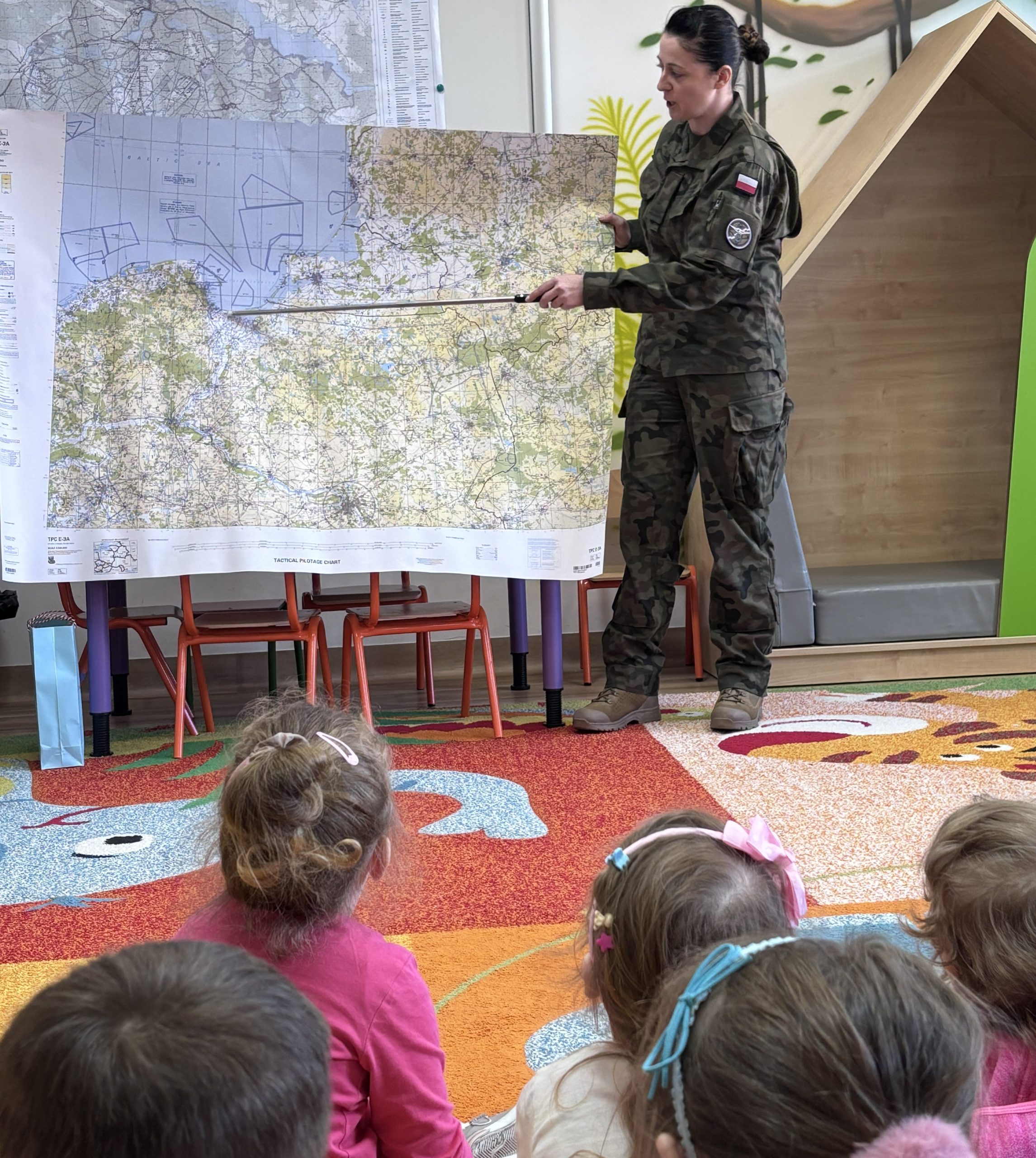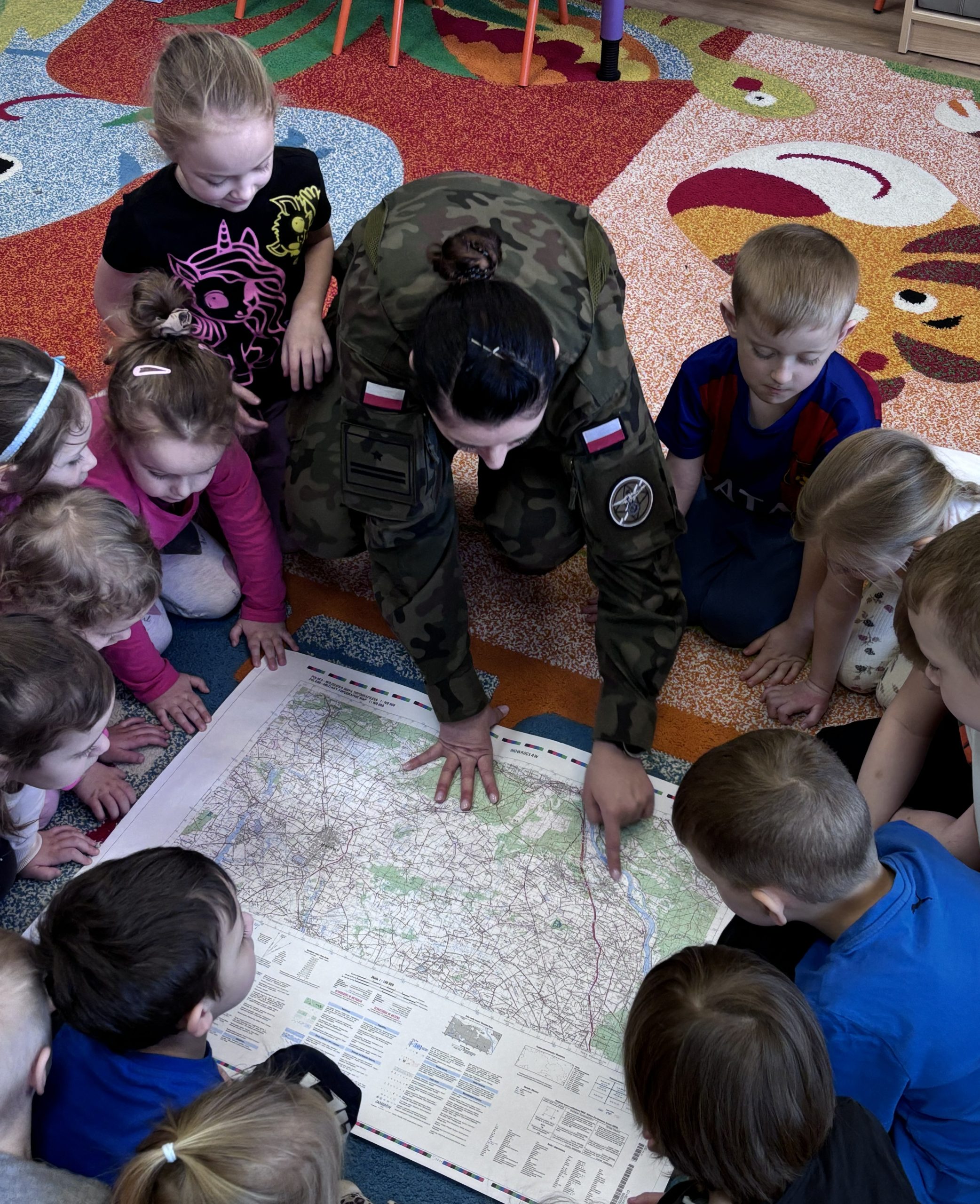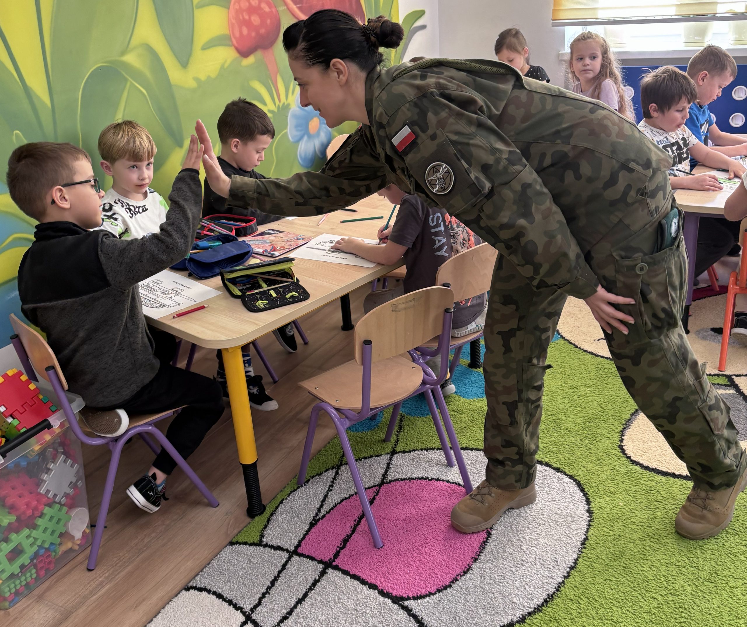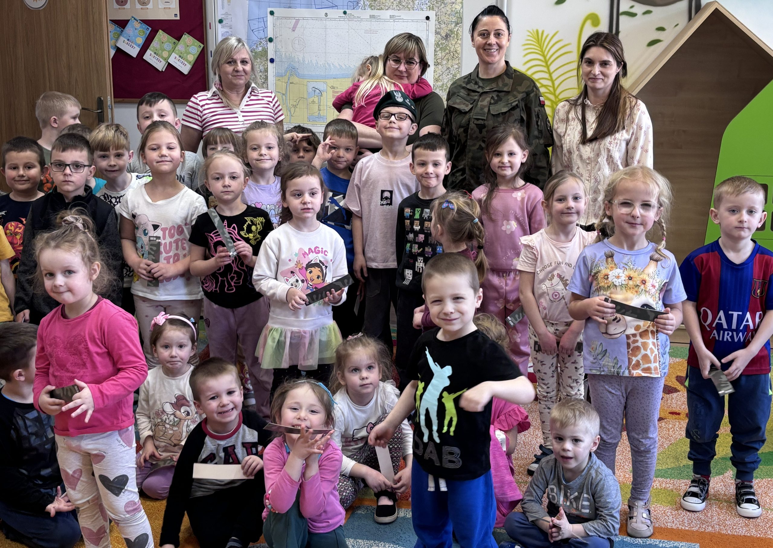 Nasze przedszkole odwiedziła wyjątkowa osoba, pani major Małgorzata Jurusik, która służy w 22 Wojskowym Ośrodku Kartograficznym. Przedszkolaki poznały zawód żołnierza, dowiedziały się, że w wojsku można pełnić różne funkcje, jak nazywają się pojazdy służące wojsku, co oznaczają naszywki na mundurze, a także miały okazje przymierzyć wojskowe nakrycie głowy.